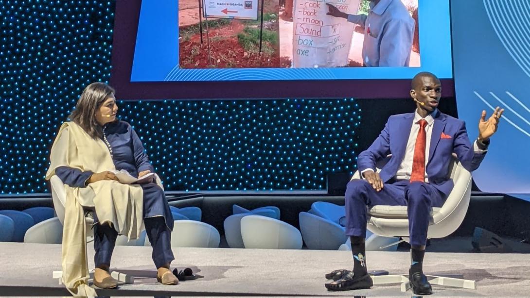 Later that day, Teach For Pakistan CEO Khadija Bakhtiar and Teach For Uganda alumnus Emmanuel Kimuli spoke alongside other teachers and leaders from educational organizations on the high-level panel “The Future of Teaching: How Best to Support Educators to be Leaders of Learning in Times of Uncertainty,” moderated by Dr. Andrew Cunningham, the Aga Khan Foundation’s Global Lead, Education. In conversation with Khadija, Emmanuel shared how, when schools closed due to the pandemic, he first kept his students learning in a village without electricity by handwriting and distributing learning packets, and then accessed tablets and solar panels and worked with the community to build a dedicated space, with windows and doors for ventilation, where the tablets could be used in order to help his students cross the digital divide. As Khadija noted, “Emmanuel shows us why we need to focus on developing the leadership of teachers and their resourcefulness.”